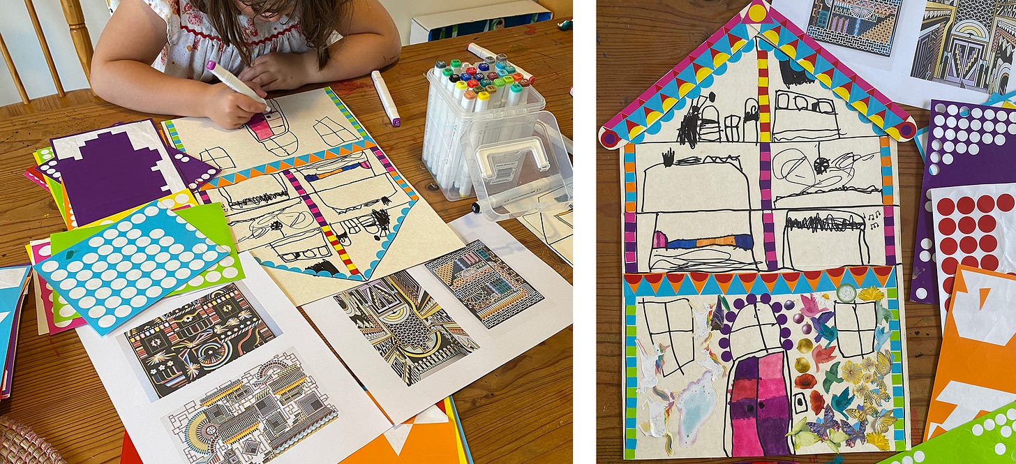 Each week in her articles, Wendy sets an assignment for her arty GUT (Grown Up Table) group. This time the prompt was to imagine and draw an ‘ecstatic architectural’ space that celebrates your community. After showing my children some of Edie Fake’s artwork, which they loved, we decided to create a drawing of what they imagine a community building for our home education co-op could look like.