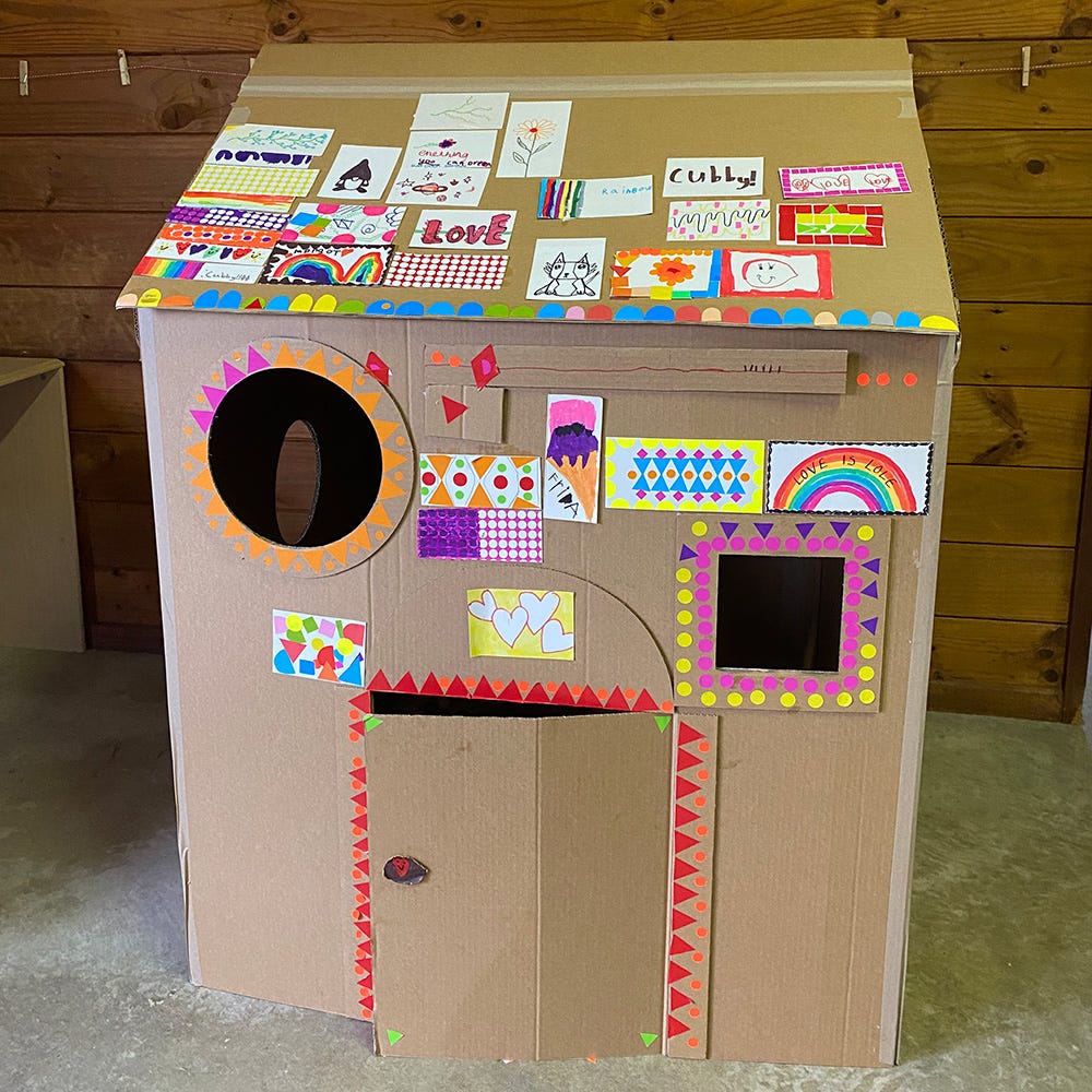 I created the first iteration of the project 4 years ago when writing my children’s craft book, Adventures in Cardboard. Since then I have made many versions for creative workshops. This house, collaboratively decorated with each of the children’s artworks, will stay at our home education co-op space for everyone to play in. A mini community building within our community space.