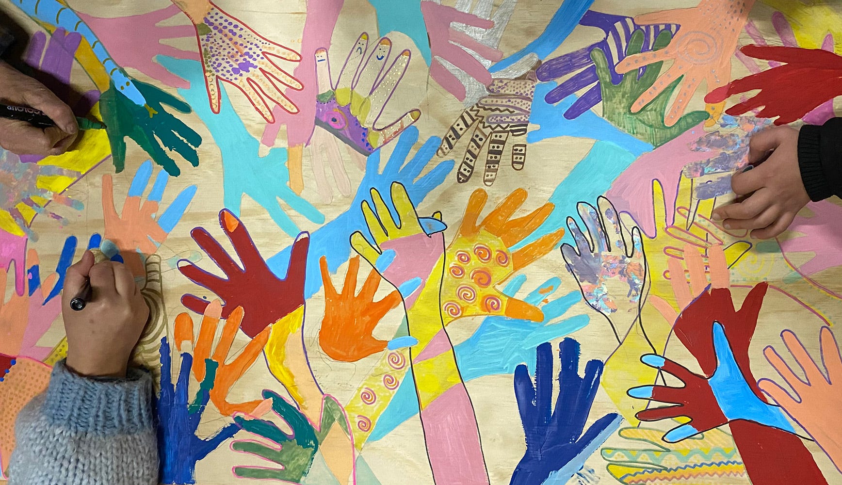 The third project we have been working on together over the last few weeks is a collaborative artwork to decorate the walls. Each child and adult involved in our community space drew around their hands onto a large board. The then painted the overlapping hands together with each person adding their creative mark.